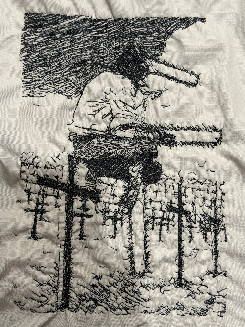 Embroidered by me. Shirt is a cotton polyester blend. Runs large.